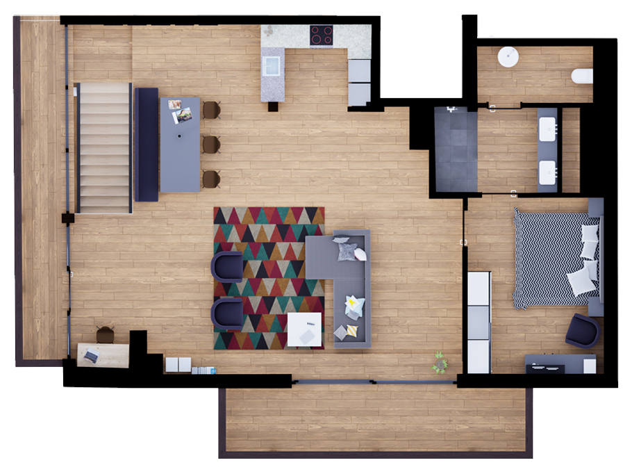 Inspired by the crystal-clear mountain lakes of the region, this apartment is an oasis of peace and lightness. Blue accents, gently curved shapes, and a fresh, clear atmosphere invite you to leave everyday life behind – like water flowing silently through the landscape.